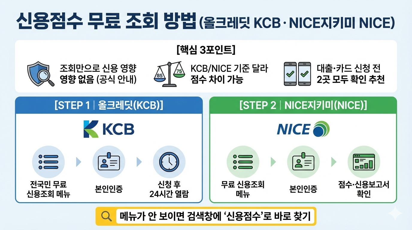 | 특징 | KCB 기준 점수 확인 | NICE 기준 점수 확인(조회는 점수에 영향 없음 안내) |
